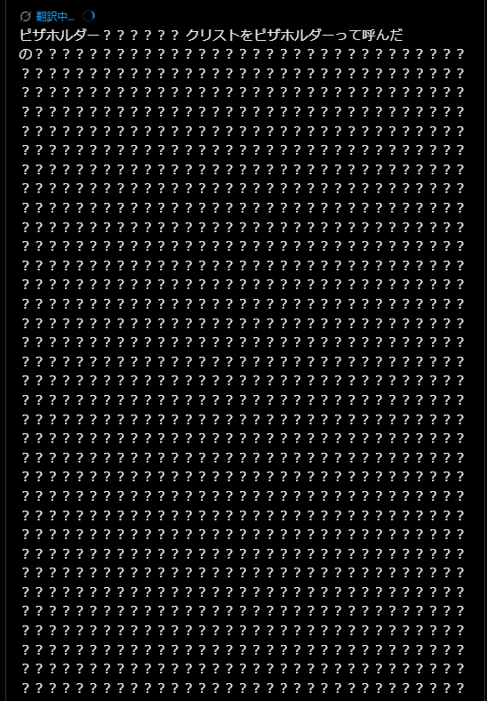 ピザについて怒ってる人の英文を翻訳したら、20個くらいだった「?」が翻訳先でエンドレスに表示され続けてここ数年見なかったブラクラみたいになって怖かった。